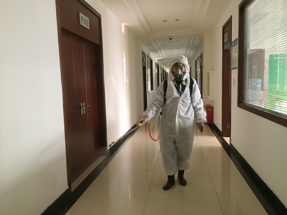圖為辦公區(qū)域消毒作業(yè)