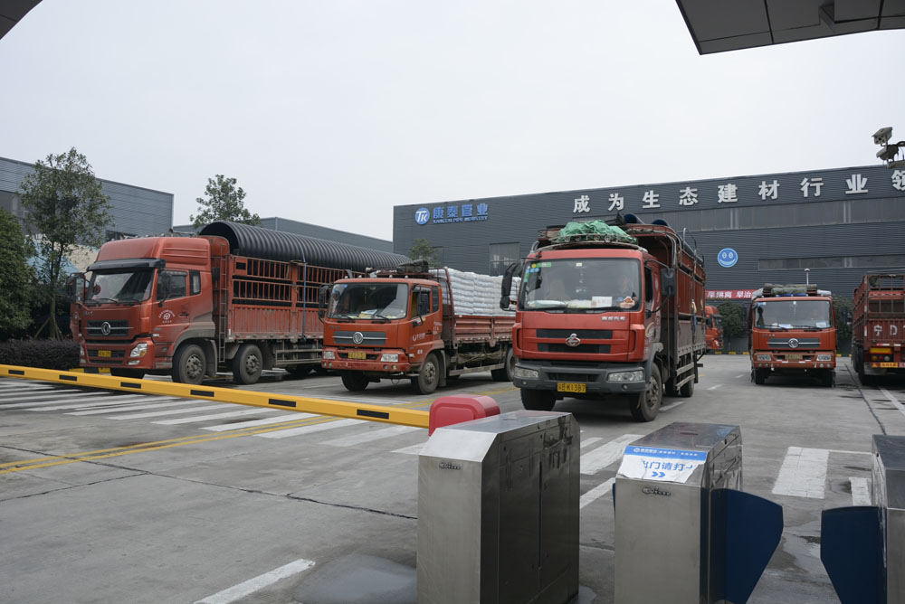 圖為大小貨車滿載產(chǎn)品等待出廠