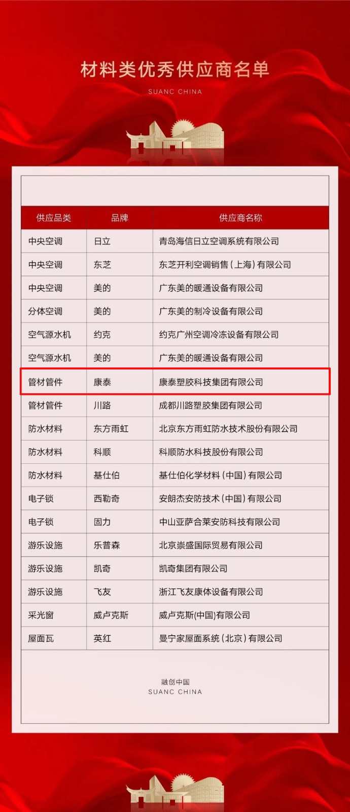 5月7日,融創(chuàng)中國通過融享供應(yīng)商交互平臺公布了“2019年度優(yōu)秀供應(yīng)商名單”??堤┘瘓F(tuán)獲得了管材管件材料類優(yōu)秀供應(yīng)商稱號?!叭趧?chuàng)中國2019年度優(yōu)秀供應(yīng)商”由材料類和施工類組成,材料類優(yōu)秀供應(yīng)商分為管材管件、防水材料、中央空調(diào)等40種供應(yīng)品類。