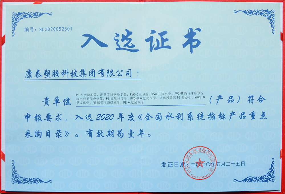 日前,水利部公布了2020年度《全國水利系統(tǒng)招標產(chǎn)品重點采購目錄》入選企業(yè)評審結果,其中康泰集團的薄壁不銹鋼給水管、PE生態(tài)給水管、PVC-O給水管、PVC-M高抗沖給水管、PVC-U雙壁波紋管、給水襯塑復合鋼管、PVC-U給水管、鋼絲網(wǎng)骨架PE復合管、MPVE?雙壁波紋管、PE實壁排污管、PE鋼帶增強螺旋管、PE雙壁波紋管憑借過硬的產(chǎn)品質量入選該名單。
