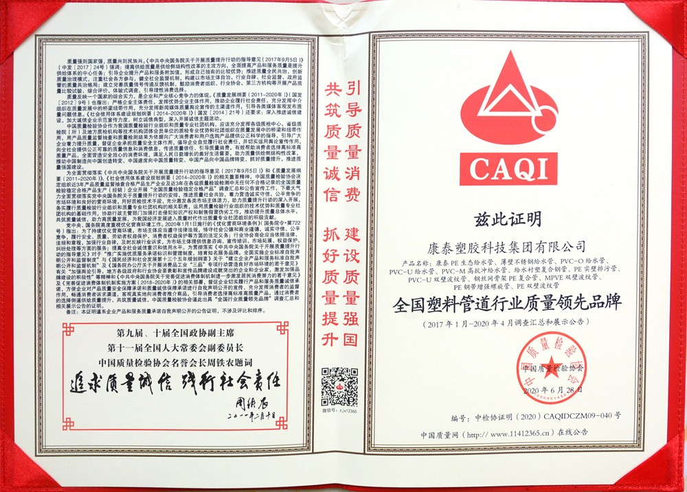 近日,康泰在中國(guó)質(zhì)量檢驗(yàn)協(xié)會(huì)主辦主題活動(dòng)中,榮獲“全國(guó)質(zhì)量誠(chéng)信先進(jìn)企業(yè)”稱號(hào),同時(shí)還獲得“全國(guó)塑料管道行業(yè)質(zhì)量領(lǐng)先品牌”、“全國(guó)質(zhì)量檢驗(yàn)穩(wěn)定合格產(chǎn)品”等榮譽(yù)。