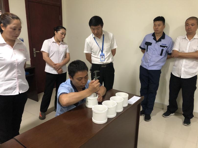 活動開始前由質(zhì)量系統(tǒng)副總監(jiān)徐水平、質(zhì)量部長李偉,分別對“質(zhì)量月”活動的由來、意義、目的和比賽的規(guī)則、比賽內(nèi)容作了講解和介紹。比賽內(nèi)容要求:1、測量產(chǎn)品標(biāo)樣由車間質(zhì)量部班長(甘艷君、周鳳瓊、吳海燕)提供,標(biāo)注序號、測量位置;2、參賽人員使用同一標(biāo)樣,同一儀器,測量同一位置,進(jìn)行測量結(jié)果數(shù)據(jù)統(tǒng)計(jì),并記錄;3、質(zhì)量部部長李偉帶領(lǐng)的評委團(tuán),對參賽人員的測量手法正確度、測量儀器熟練度和測量結(jié)果進(jìn)行考核評比。