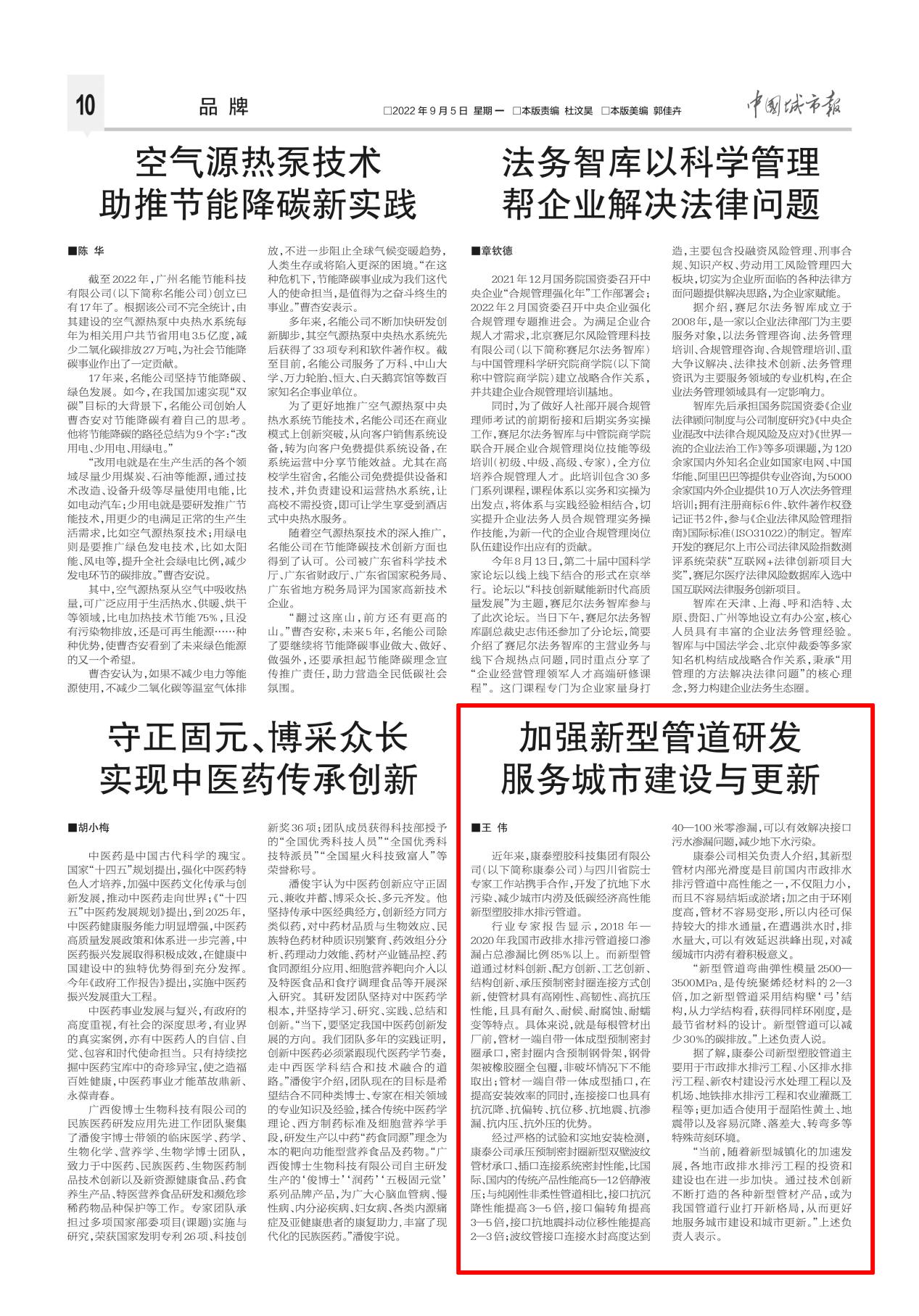 “當前,隨著新型城鎮(zhèn)化的加速發(fā)展,各地市政排水排污工程的投資和建設(shè)也在進一步加快。通過技術(shù)創(chuàng)新不斷打造的各種新型管材產(chǎn)品,或為我國管道行業(yè)打開新格局,從而更好地服務城市建設(shè)和城市更新?!鄙鲜鲐撠熑吮硎?。(摘編自《中國城市報》2022年9月5日第388期第10版)
