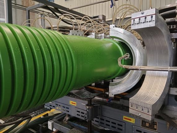 “新型管道彎曲彈性模量 2500—3500MPa,是傳統(tǒng)聚烯烴材料的 2—3倍,加之新型管道采用結(jié)構(gòu)壁‘弓’結(jié)構(gòu),從力學結(jié)構(gòu)看,獲得同樣環(huán)剛度,是最節(jié)省材料的設(shè)計。新型管道可以減少30%的碳排放?!鄙鲜鲐撠熑苏f。