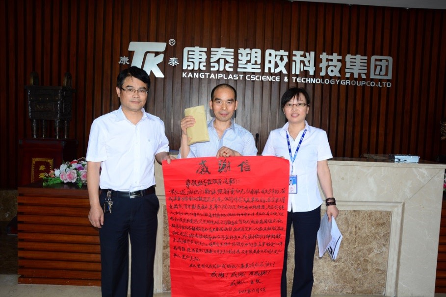?????? 在接收現(xiàn)場,集團工會主席吳彬和人力資源中心經(jīng)理呂旭梅熱情的接過了王敏的感謝信,同時將全體康泰人的愛心捐款和康泰愛心基金撥款共計3萬余元轉(zhuǎn)交給了王敏本人,并祝愿他早日康復(fù),囑咐他一定要好好治病,早日回到康泰,回到工作中來。接過捐款,王敏的心情很激動。雖然他的身體還不適合大量運動,但他還是堅持要親自到公司來遞上感謝信。他說,“因為有全體各級領(lǐng)導(dǎo)和員工最真摯的愛心伴我同行,使我看到了康泰公司美好的未來。康泰就是我的家,希望康泰公司明天更加壯大,更加美好!在這里,我代表我和我的家人最真誠的感謝公司及各位關(guān)心支持我的各位同仁、各位素不相識的人士!感謝!感謝!再感謝!”