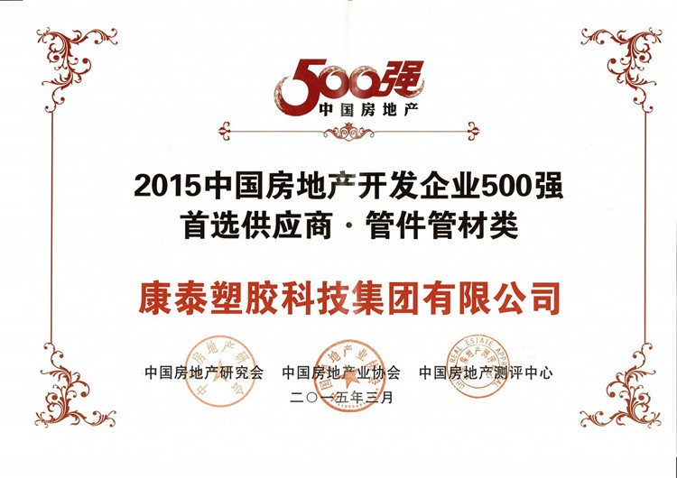 ?????? 日前,“2015中國房地產(chǎn)500強測評成果發(fā)布會暨500強峰會”在北京國貿(mào)隆重舉行。值得恭賀的是,康泰集團(tuán)首次入圍“地產(chǎn)500強首選供應(yīng)商 管件管材類”榜單,獲得了由中國房地產(chǎn)研究會、中國房地產(chǎn)業(yè)協(xié)會和中國房地產(chǎn)測評中心聯(lián)合頒發(fā)的“2015中國房地產(chǎn)開發(fā)企業(yè)500強首選供應(yīng)商品牌”榮譽證書。