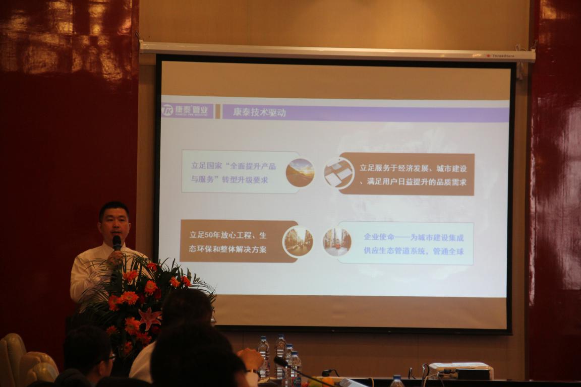 接著,康泰集團技術總監(jiān)張雙全向在場嘉賓介紹了康泰集團的新產品體系,重點介紹了康泰MPP單壁波紋管道系統(tǒng)、環(huán)保雨、污水用MPVE?雙壁波紋管道系統(tǒng)等產品。參會嘉賓認真聽取了公司的產品介紹,對康泰新產品的物理性能、產品質量和化學配方等方面給予了高度評價。