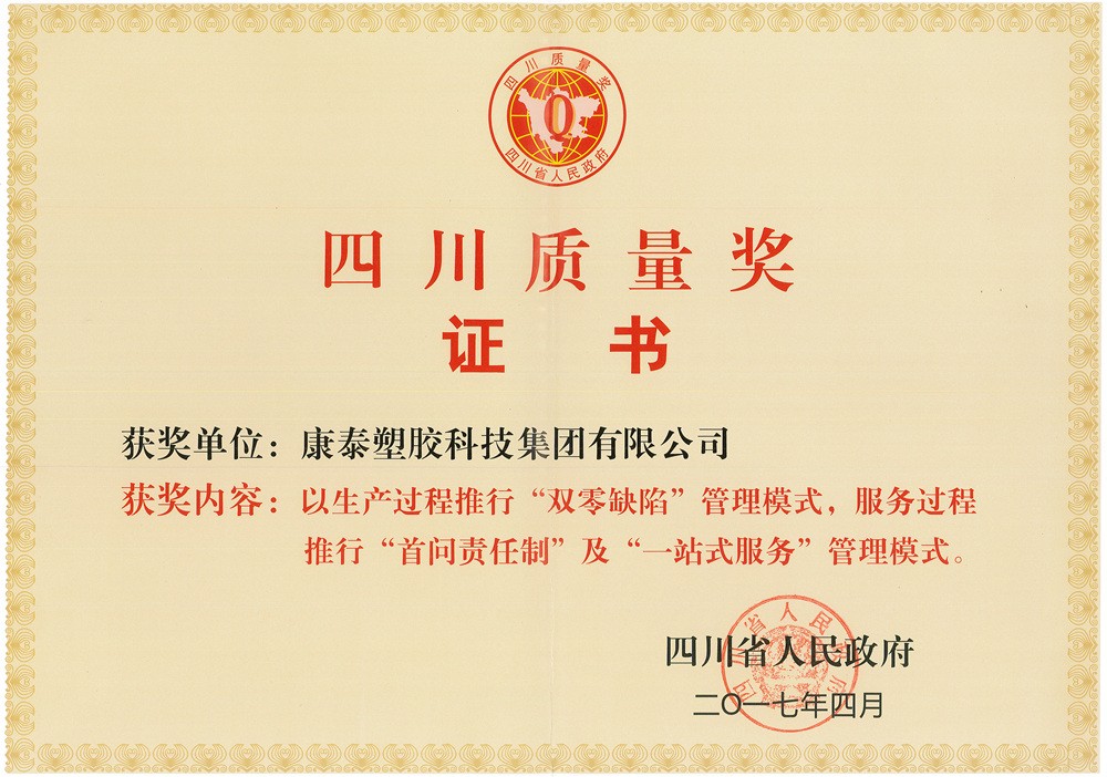 三是質(zhì)量強(qiáng)企,獲得第四屆四川質(zhì)量獎??堤┘瘓F(tuán)以“圍繞全球顧客、不斷改善,追求產(chǎn)品零缺陷”的質(zhì)量方針,貫徹“產(chǎn)品如人品”的質(zhì)量理念,全面覆蓋ISO9001、ISO14001、OHSAS18001三體系,實(shí)施全員、全面質(zhì)量管理,通過導(dǎo)入PDCA循環(huán)管理和QCC體系,嚴(yán)格質(zhì)檢把控,確保從原料進(jìn)廠到產(chǎn)品出廠的優(yōu)質(zhì)質(zhì)量保障??堤┫群髽s獲全國質(zhì)量誠信標(biāo)桿典型企業(yè)、全國質(zhì)量檢驗(yàn)穩(wěn)定合格產(chǎn)品、全國百佳質(zhì)量誠信標(biāo)桿示范企業(yè)等榮譽(yù)稱號。2017年,憑借“生產(chǎn)過程推行‘雙零缺陷’管理模式,即供應(yīng)鏈來料100%合格進(jìn)廠、產(chǎn)品質(zhì)量100%合格出廠,始終貫徹執(zhí)行態(tài)度零容忍、質(zhì)量零缺陷的‘雙零缺陷’管理模式”??堤┘瘓F(tuán)從全省眾多優(yōu)秀企業(yè)中脫穎而出,成為唯一獲得第四屆“四川質(zhì)量獎”的塑膠建材企業(yè)。