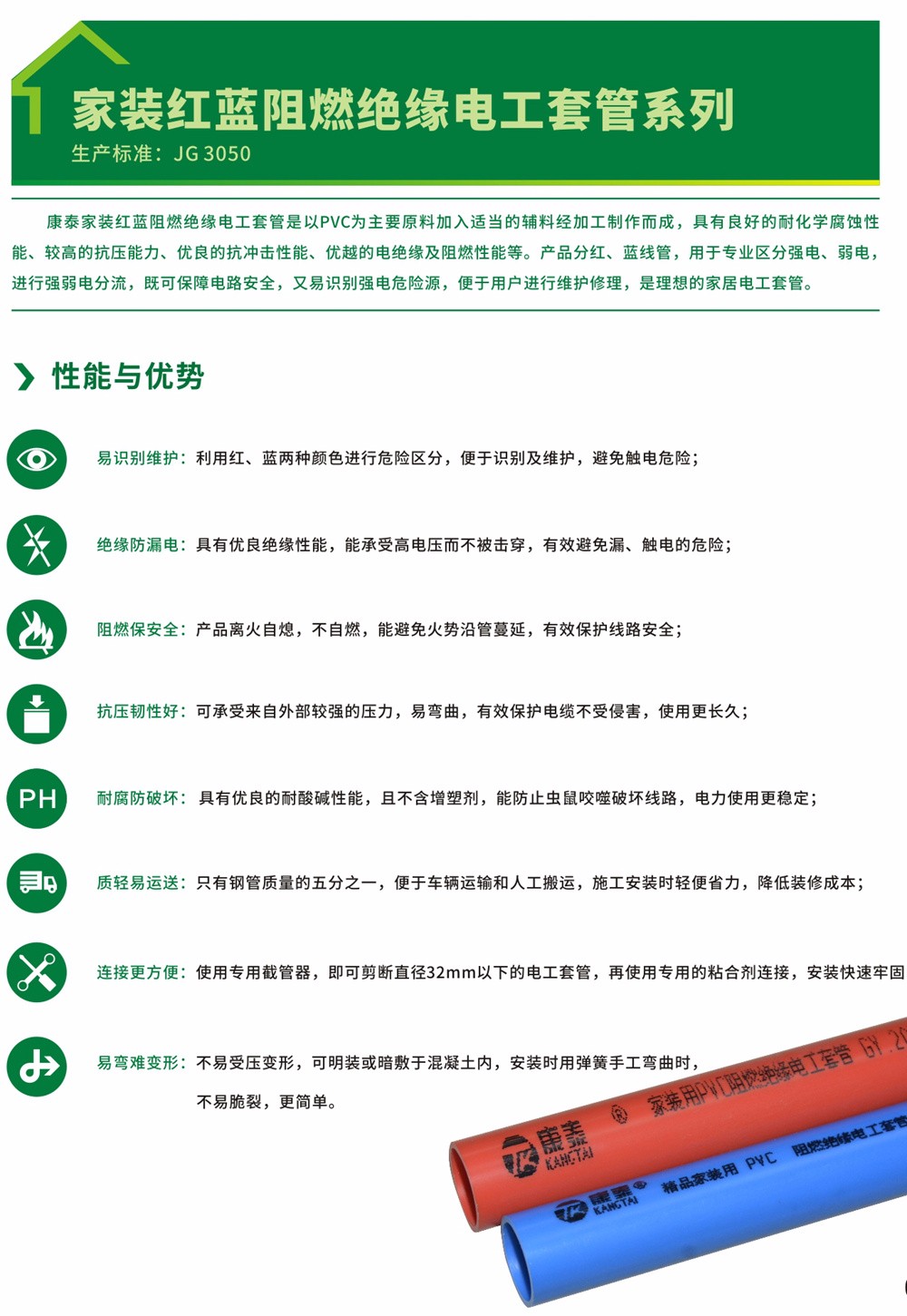 康泰家裝紅藍阻燃絕緣電工套管是以PVC為主要原料加入適當?shù)妮o料經(jīng)加工制作而成,具有良好的耐化學腐蝕性能、較高的抗壓能力、優(yōu)良的抗沖擊性能、優(yōu)越的電絕緣及阻燃性能等。產(chǎn)品分紅、藍線管,用于專業(yè)區(qū)分強電、弱電,進行強弱電分流,既可保障電路安全,又易識別強電危險源,便于用戶進行維護修理,是理想的家居電工套管。